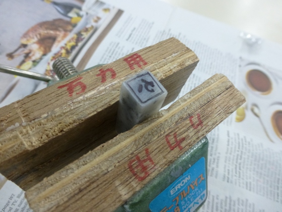 印床という篆刻用の固定治具も世の中にはありますので、自身で購入してもよいのですが、ものづくり工房にはポータブルの小さな万力があり、それでも十分代用できます。ただし、金属で挟むと破損する可能性が大きいため、必ず木を間に挟みましょう。また、強く締めすぎないように注意!